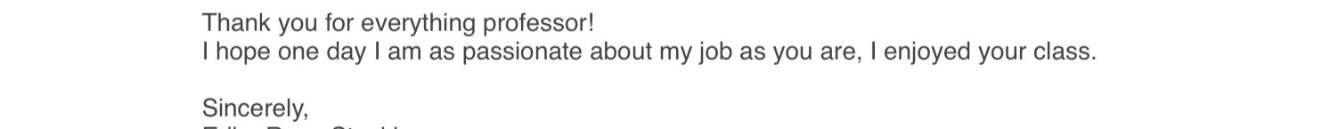 “Now that the semester is coming to a close, I realize that in the last four years of my undergraduate career, I had yet to enjoy a class as much as I did [this one]. I was able to see myself transform from an anxious 21-year old who possessed a “left-brained”, analytical mentality to a slightly less anxious 21-year old with new found passion for musical theatre and dance. I intend to take this mindset with me as I embark on my post-graduation career and I thank you for a great semester!”