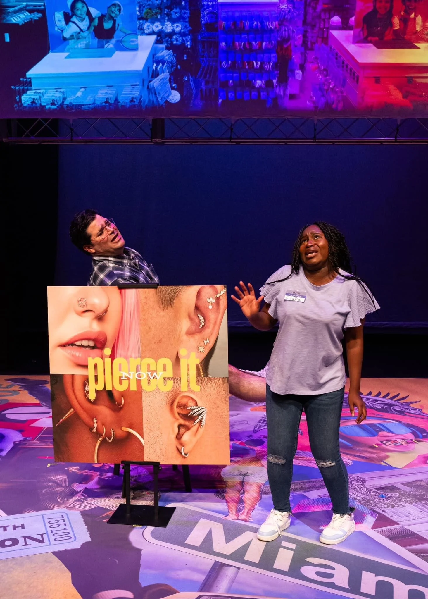Alex Alvarez and Kimberly Vilbrun-Francois in “Dickery Pokery” at City Theatre’s Summer Shorts: Flipping the Script. Director: Karina Batchelor, Intimacy Director: Nicole Perry.