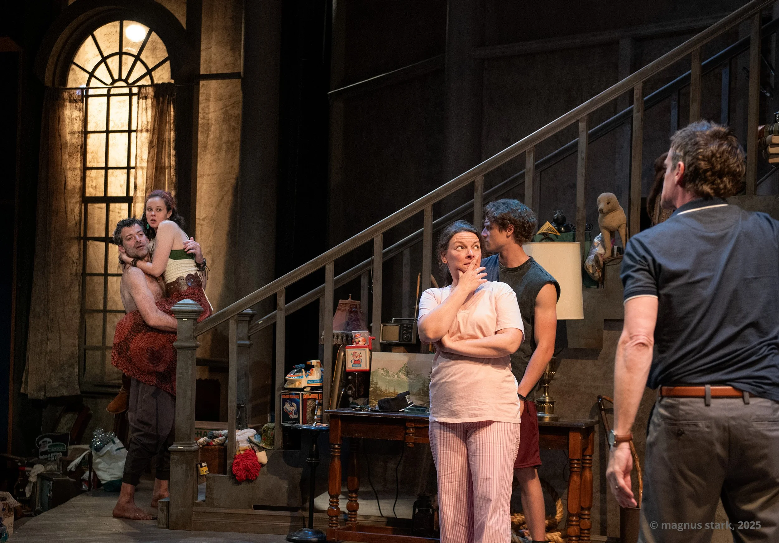 Tony Larkin as Franz and Natalie Donahue McMahon as River, witnessed by Rachel Burrtram, Brando LaFleur, and Mark H. Dold in “Appropriate” at GableStage, February 2025.. Director: Bari Newport. Intimacy Choreographer: Nicole Perry. Photographer: Magnus Stark.